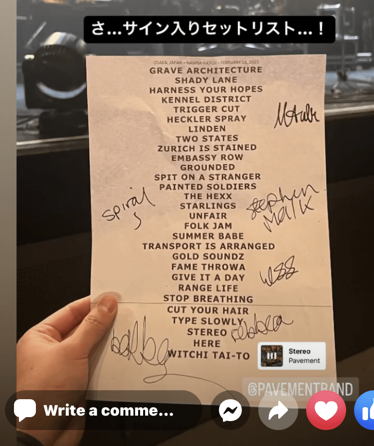 2023年2月18日,沒有人真的死去,至少他們這樣說。演唱會第一首歌是 〈grave architecture〉,巫師 SM 在大阪 Namba Hatch 築起了這次旅程,這趟旅程的目的在於追捕一群追隨者,大概因為 SM 已經拋棄了他們不下數次,Pavement 在1999年丟下《Terror Twlight》大碟便因為內部問題解散,他們也隨著 SM 2000年的個人同名專輯缺席了一個十年,對上一次重組走巡迴已經是2010年的事,這次他們努力演活那個專屬90年代的獨立氛圍,Spira Stars 游走在歌曲中的噪音結他、Mark 的招牌雙腳踱步 bass,Bob 的手搖鈴穿插他奇怪的叫喊聲,在 SM 口中的「拼湊所有東西在一起的膠水」,歌單讓每一張專輯也滲透其中, 〈linden〉〈unfair〉〈grounded〉〈spit on a stranger〉〈shady lane〉〈harness your hopes〉,那些在腦海裡播放了無數次的歌曲,終於在現場解放出來,得到實現。SM 表示很喜歡大阪,更說:「We play, eat and buy shit,very nice」雖然已經五十多歲,但 SM 的聲線好像沒有變過,還是那個在 〈major league〉裡拿著花的男孩。