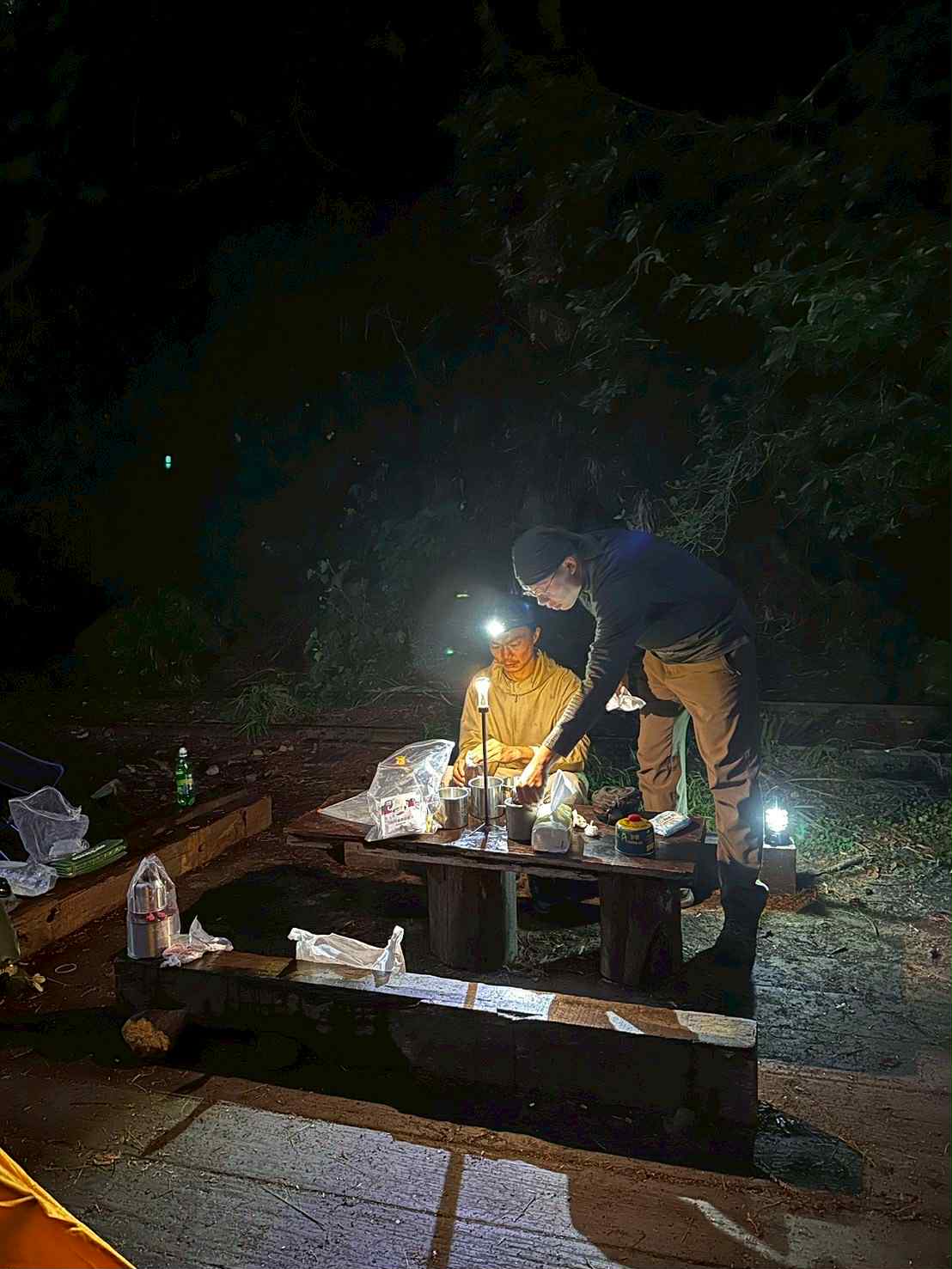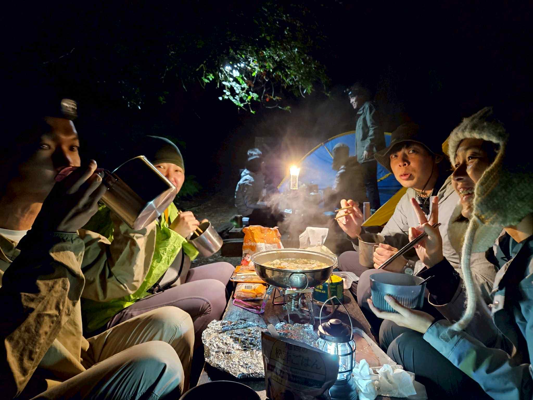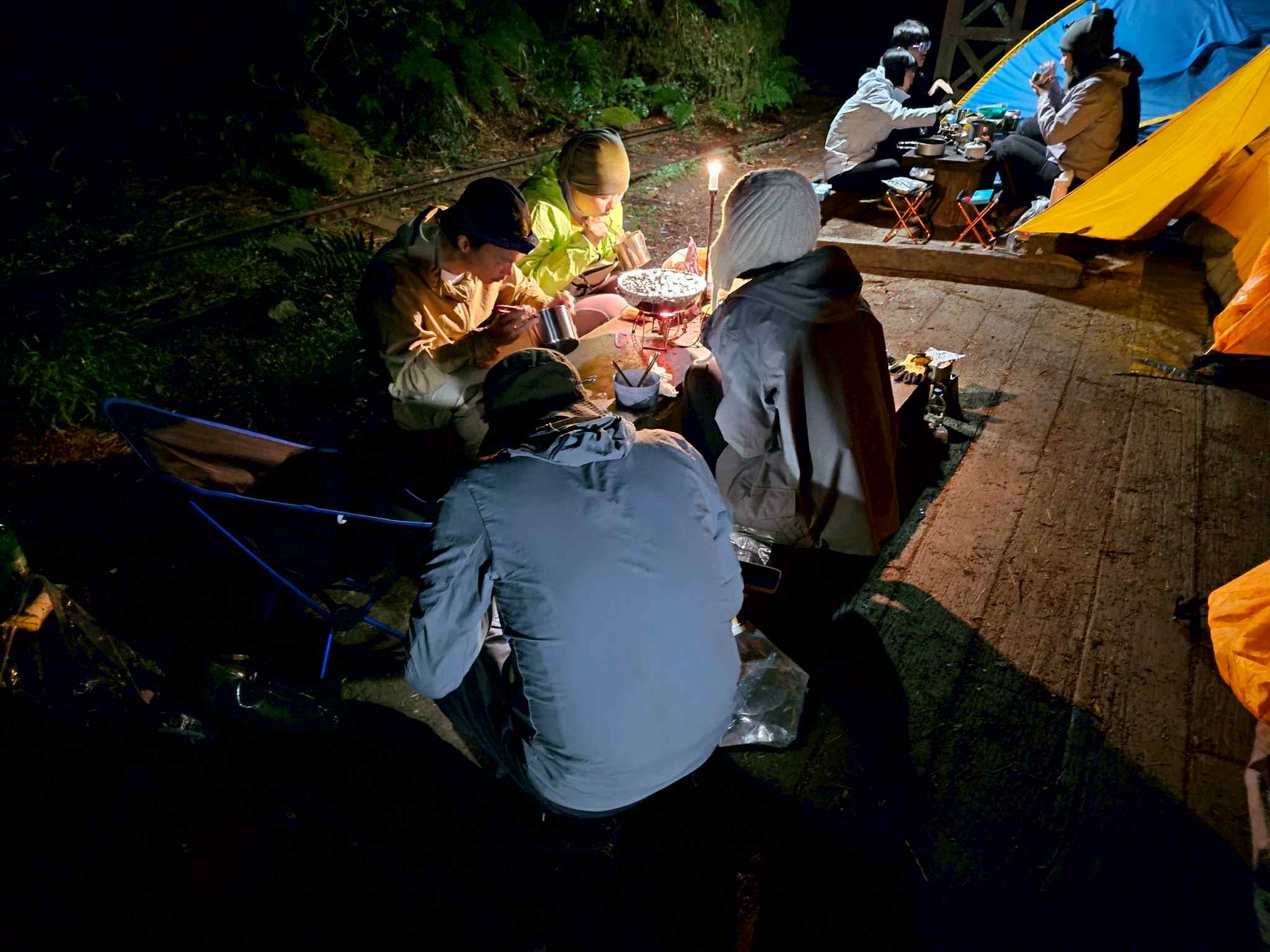 在石猴設營,大家都肚子餓,也開始煮起晚餐。晚餐非常豐富,有乾燥飯和火鍋,吃完飯也開始喝茶,聊天,一行五人大家都很累,真正喝酒的只有兩人。有時我覺得怎樣是一個利害的本地人呢,就是他們各自都對自己成長的地方充滿關懷,石猴的名稱源自一塊石頭,那石在921的時候也一同毀了,眠月線是相傳有個人在這裡午睡,醒來時精神抖擻而稱之眠月。石頭可以毀掉,眠月線可以再不通車,那些故事卻會留下來。