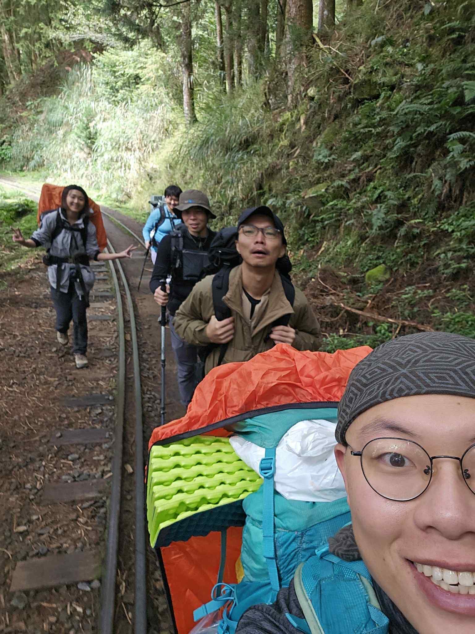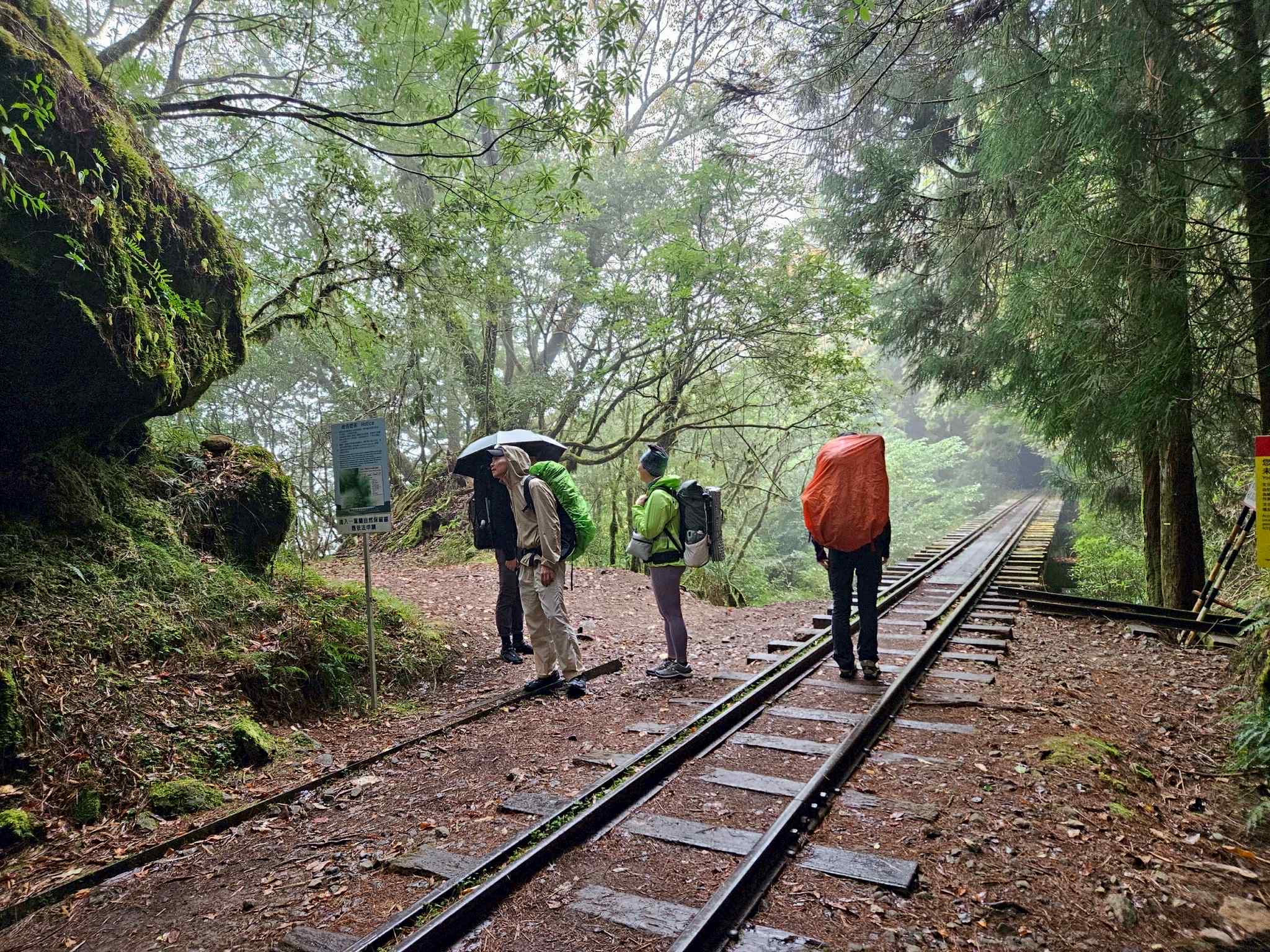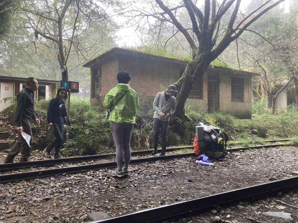 由園區出發,開始都是上上落落的郊遊徑,亞里山已是發展非常完善的旅遊區,沿路上山都有很多旅館,食店,經營「駁腳」的私家車生意。開始行是蠻累的,因為我們都背很多東西,又上又落的路也吃力。大概四十五分鐘,我們開始走上鐵軌,應該是山邊的區域了,明隧道旁左手面都是山,但天氣不是很好的源故,也只看到霧。再繼續走,路開始變有趣和崎嶇,第一個帶難度的點是山崖的塌方處,那是一個塞車點,下大雨的時候還是一個瀑布,幸好沿著塌方處都有鐵梯和繩索輔助,只要小心一點就沒有問題。
