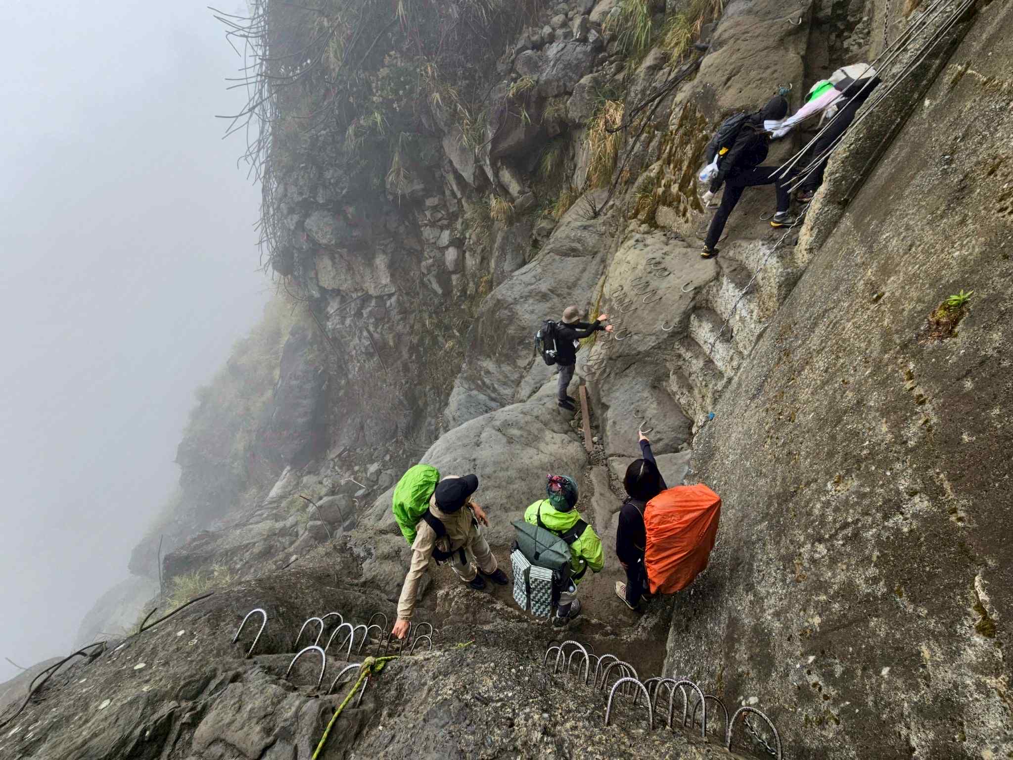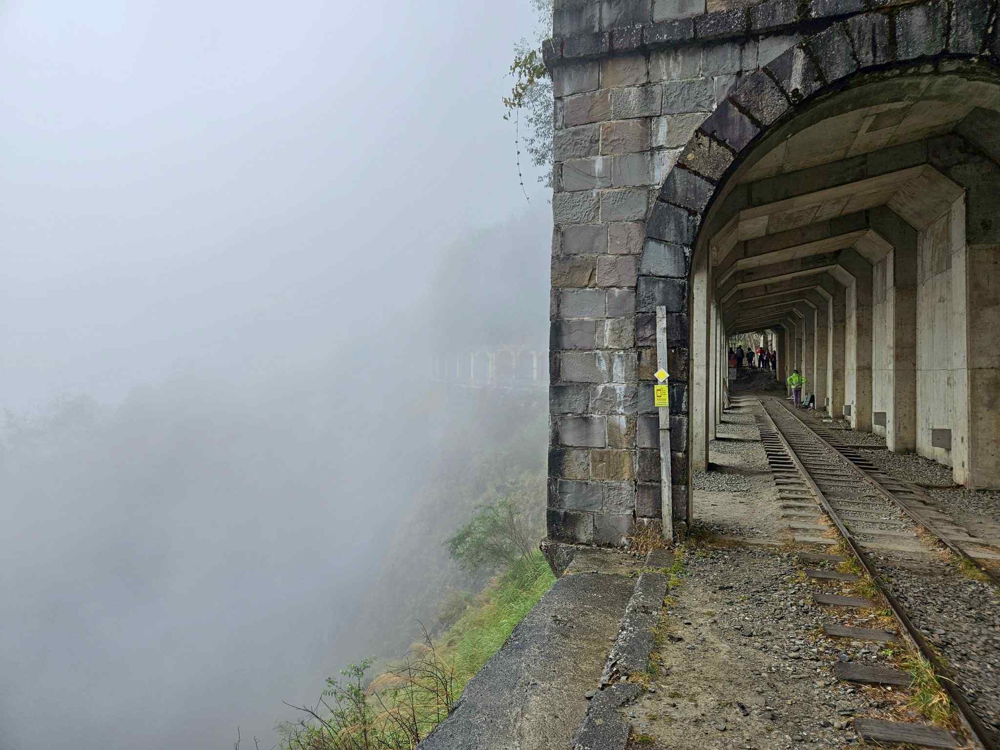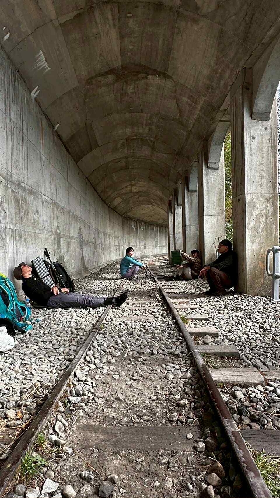 由園區出發,開始都是上上落落的郊遊徑,亞里山已是發展非常完善的旅遊區,沿路上山都有很多旅館,食店,經營「駁腳」的私家車生意。開始行是蠻累的,因為我們都背很多東西,又上又落的路也吃力。大概四十五分鐘,我們開始走上鐵軌,應該是山邊的區域了,明隧道旁左手面都是山,但天氣不是很好的源故,也只看到霧。再繼續走,路開始變有趣和崎嶇,第一個帶難度的點是山崖的塌方處,那是一個塞車點,下大雨的時候還是一個瀑布,幸好沿著塌方處都有鐵梯和繩索輔助,只要小心一點就沒有問題。